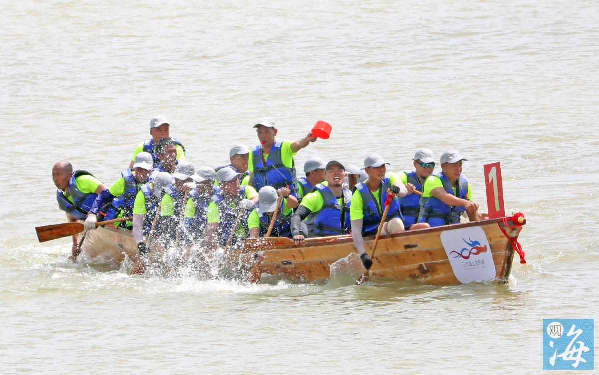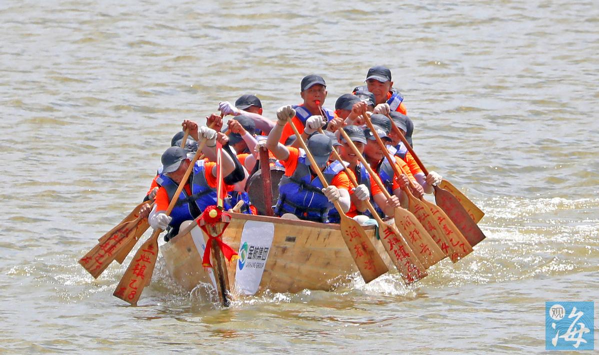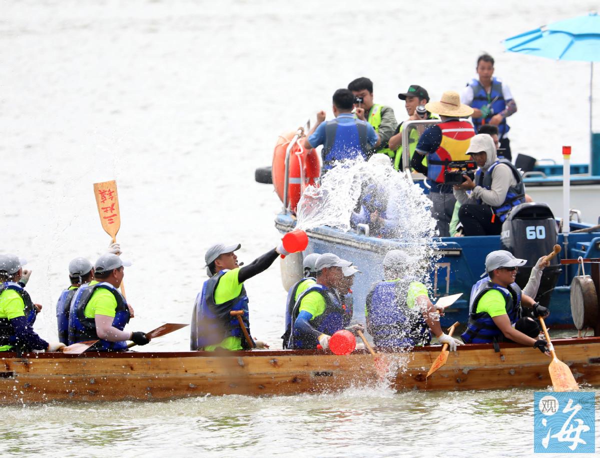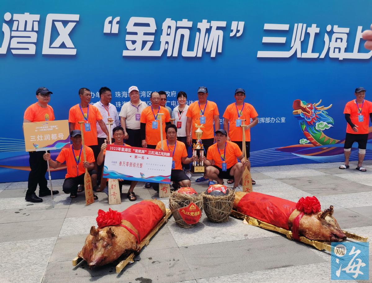 扛起烧猪,哗哗地倒下一坛子酒,这一瞬间,空气中弥漫着观众与冠军队伍共庆胜利的喜悦和酒香。6月21日端午节前夕,2023年金湾区“金航杯”三灶海上龙舟赛在金湾东路悦览馆前方海域举行。阔别8年,三灶海上龙舟赛这项珠海市级非物质文化遗产再次回到市民的生活中,那回响百年的敲锣声和哨声,那龙舟汉子挥桨溅起的一朵朵水花,那一个个海浪之上龙舟的急转弯,为老居民留住了乡愁,为新生代展示了非遗魅力。