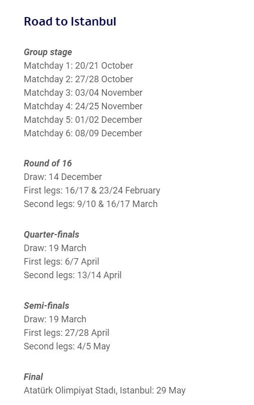 欧冠小组赛将于10月20日打响,小组前两名进入16强,12月14日进行淘汰赛抽签。欧冠决赛将于2021年5月29日在伊斯坦布尔阿塔图尔克奥林匹克体育场举行。