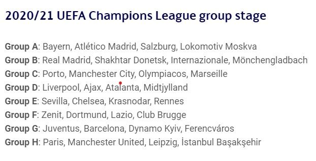 具体抽签结果如下:欧冠卫冕冠军拜仁慕尼黑与马德里竞技、奥地利萨尔茨堡红牛队、俄超莫斯科火车头队分在A组;皇马与国际米兰、门兴格拉德巴赫以及乌克兰顿涅茨克矿工分在B组;曼城与葡超波尔图、希腊超级联赛奥林匹亚科斯以及法甲马赛分在C组;利物浦与阿贾克斯、亚特兰大以及丹麦的中日德兰在D组相遇;欧罗巴联赛冠军塞维利亚与切尔西、俄超克拉斯诺达尔和法甲雷恩分在E组;多特蒙德与拉齐奥、俄超圣彼得堡泽尼特和比利时甲级联赛的布鲁日约战F组;尤文图斯、巴塞罗那、乌克兰基辅迪纳摩、匈牙利甲级联赛的费伦茨瓦罗斯同在G组;曼联与巴黎圣日耳曼、莱比锡和土超伊斯坦布尔队分在H组。