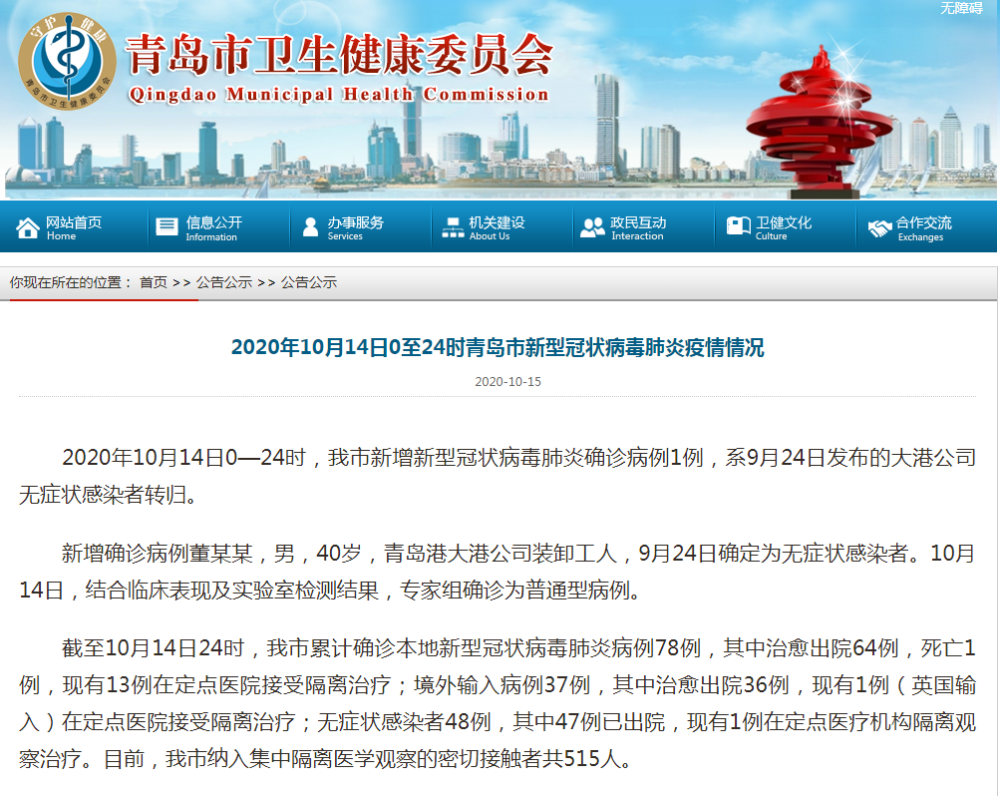 截至10月14日24时,青岛市累计确诊本地新型冠状病毒肺炎病例78例,其中治愈出院64例,死亡1例,现有13例在定点医院接受隔离治疗;境外输入病例37例,其中治愈出院36例,现有1例(英国输入)在定点医院接受隔离治疗;无症状感染者48例,其中47例已出院,现有1例在定点医疗机构隔离观察治疗。目前,青岛市纳入集中隔离医学观察的密切接触者共515人。