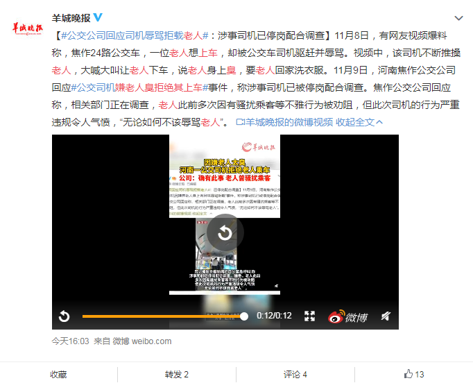 视频中,该司机不断推搡老人,大喊大叫让老人下车,说老人身上臭,要老人回家洗衣服。11月9日,河南焦作公交公司回应#公交司机嫌老人臭拒绝其上车#事件,称涉事司机已被停岗配合调查。焦作公交公司回应称,相关部门正在调查,老人此前多次因有骚扰乘客等不雅行为被劝阻,但此次司机的行为严重违规令人气愤,“无论如何不该辱骂老人”。