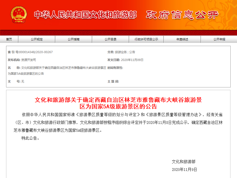 文化和旅游部关于确定西藏自治区林芝市雅鲁藏布大峡谷旅游景区为国家5A级旅游景区的公告