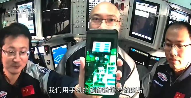 在现场,“沧海”号在拍“奋斗者”号,“奋斗者”号中的潜航员也在擦拭观察窗用自己的手机拍“沧海”号。这对海底互拍的超强CP还实现了全球首次万米洋底的电视直播。