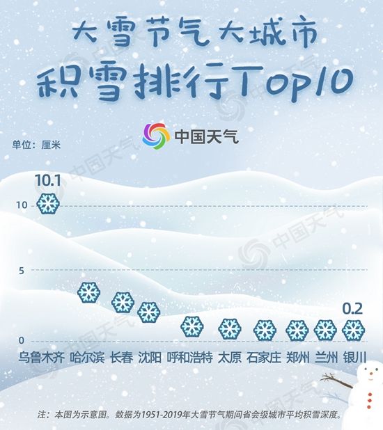 常年大雪节气期间,北方部分地区的平均积雪深度能达到3厘米以上,省会级大城市中,乌鲁木齐最高,达10.1厘米,哈尔滨、长春的平均积雪深度也在3-3.7厘米。从积雪最大深度来看,乌鲁木齐和哈尔滨在大雪节气期间都曾出现过40厘米以上的积雪。