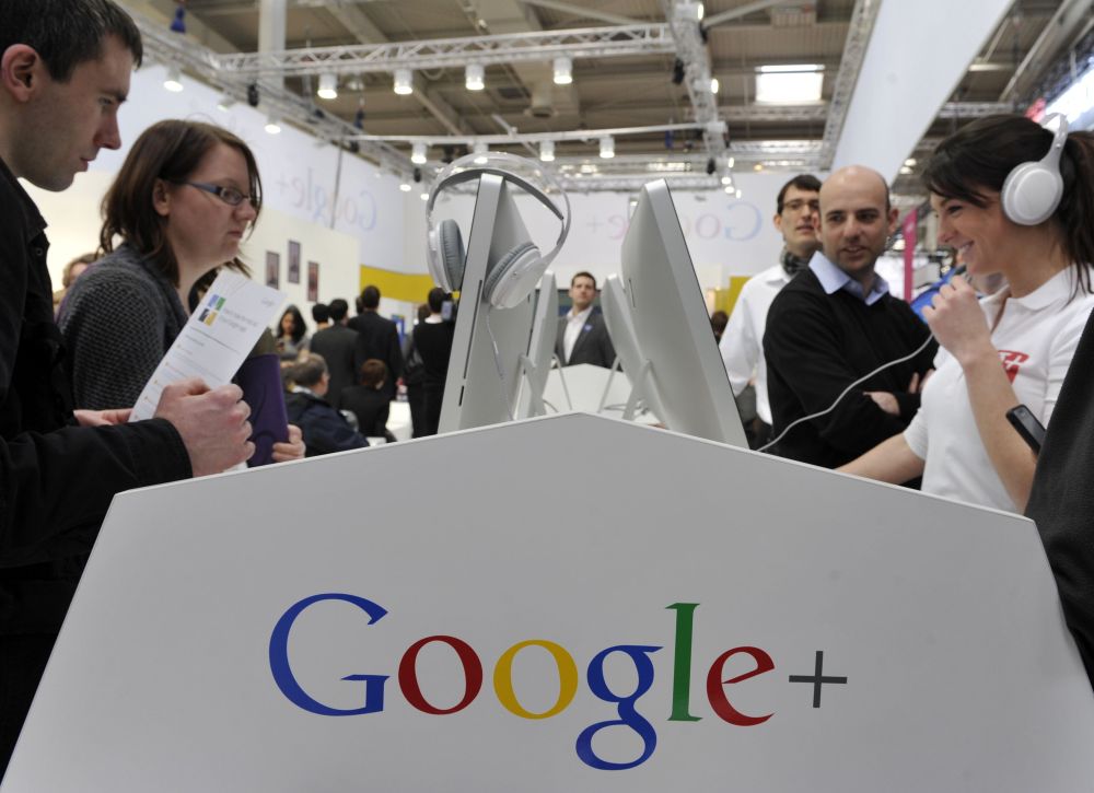 2012年3月6日,在德国汉诺威会展中心举行的汉诺威信息及通信技术博览会上,参观者在谷歌展台参观。