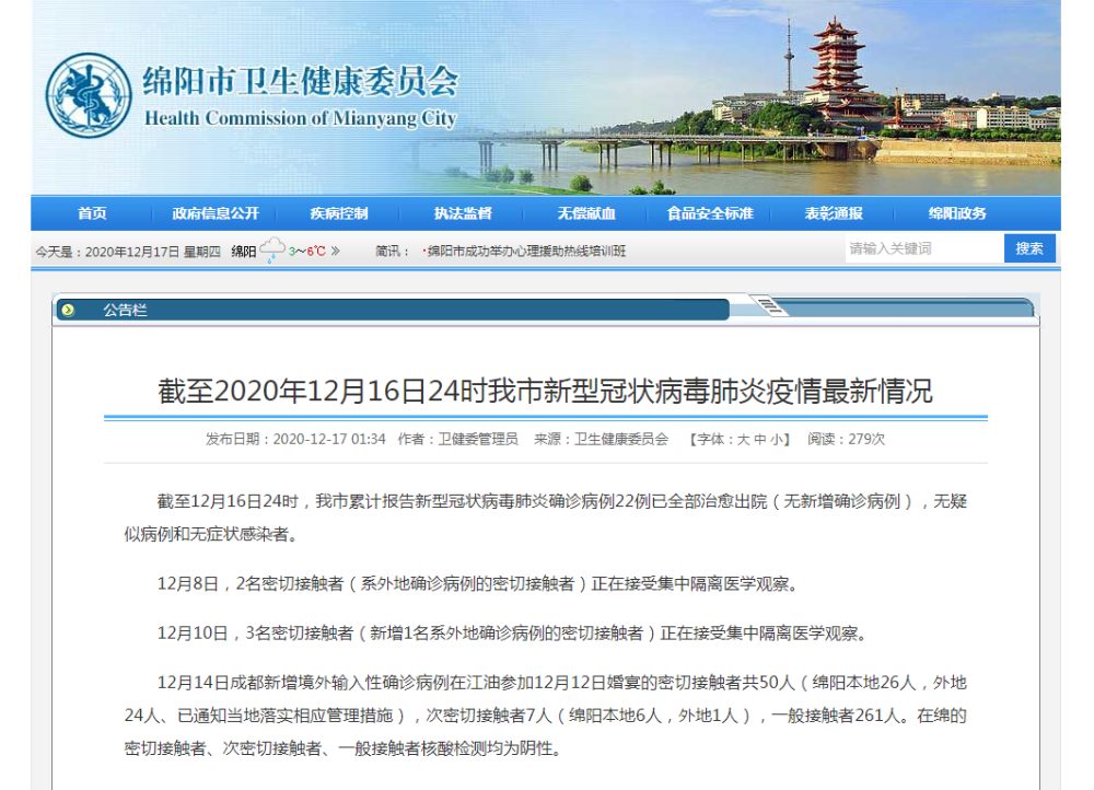 截至12月16日24时,绵阳市累计报告新型冠状病毒肺炎确诊病例22例已全部治愈出院(无新增确诊病例),无疑似病例和无症状感染者。