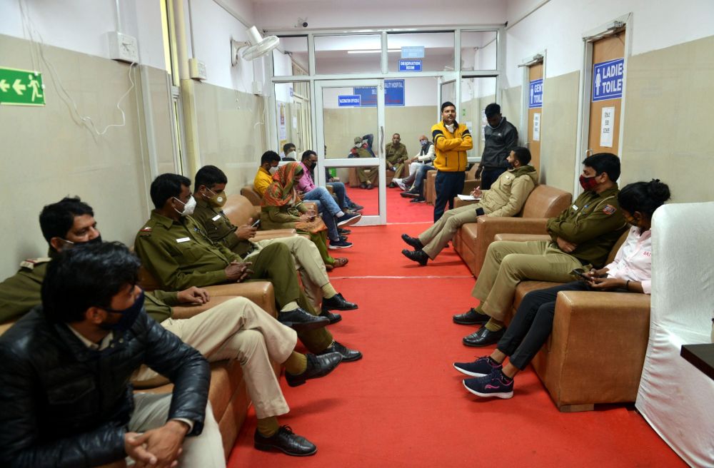 2月13日,警察在印度首都新德里的医院里等待接种新冠疫苗。(新华社发,帕塔·萨卡尔摄)