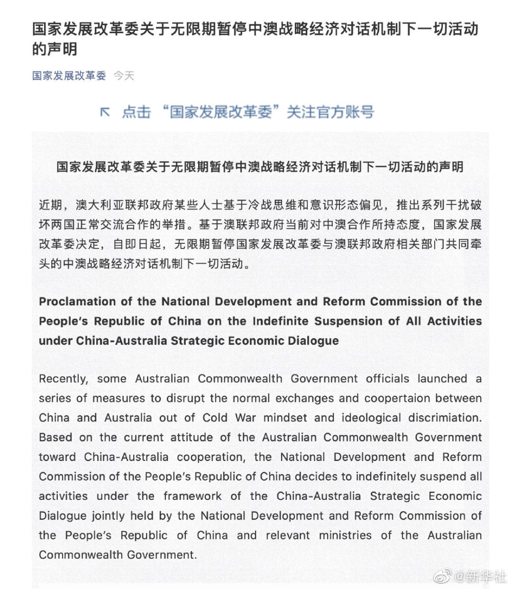 国家发改委:无限期暂停中澳战略经济对话机制下一切活动
