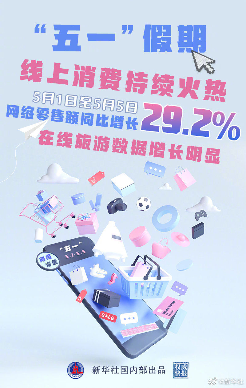 商务部6日发布的数据显示,“双品网购节”前8天(4月28日至5月5日),线上消费提质升级效果明显:全国网络零售额达到3818亿元,同比增长28.1%。在网购节带动下,“五一”假期,网络零售额同比增长29.2%。五一在线旅游增长迅速:零售额同比大幅增长371.2%,国内线上旅游产品和景点门票销售额同比分别增长526.3%和 300.7%;高品质出游则成新趋势,私家团游、亲子游、红色游同比分别增长超10倍、7倍和2倍;在线餐饮“紧随其后”,零售额同比增长56.7%,在外地出游和亲朋聚餐推动下,在线餐饮到店销售额同比增长272.3%。