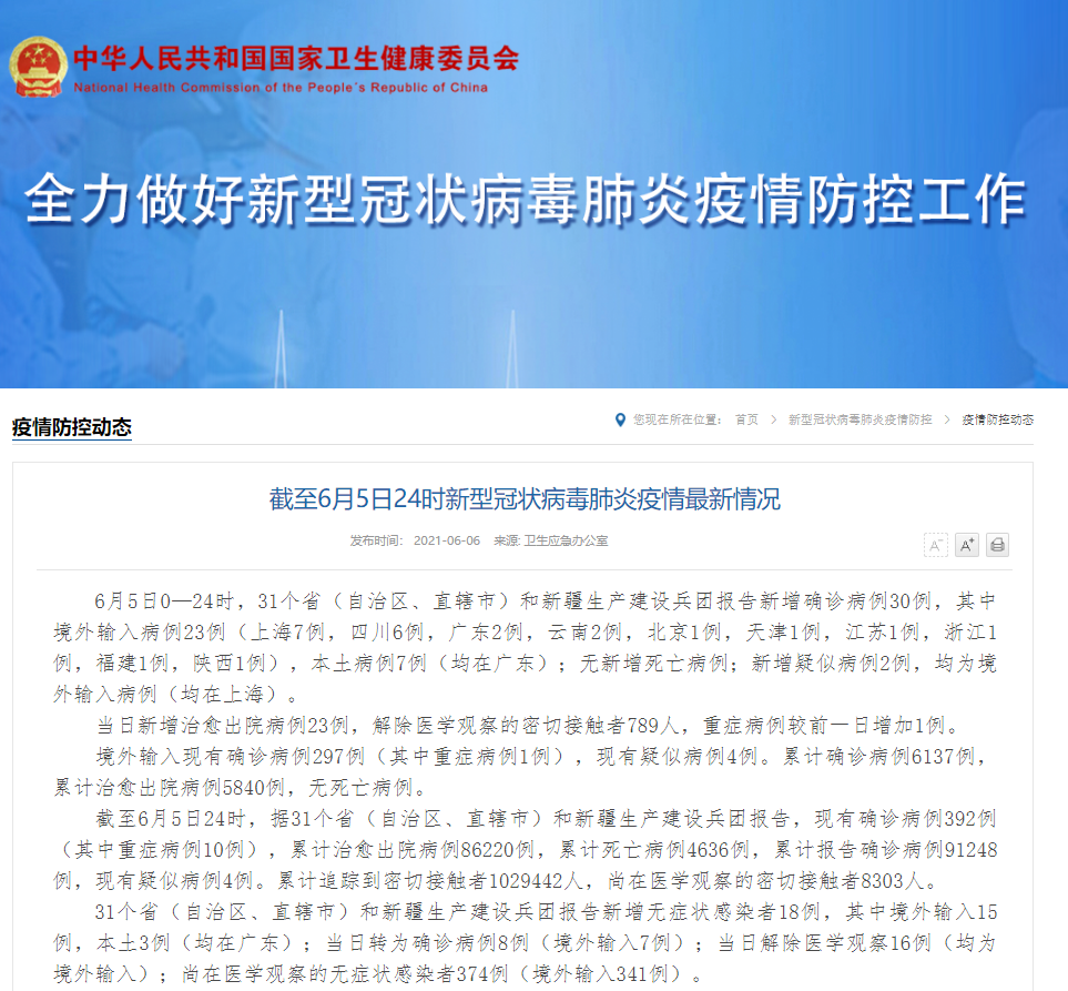 6月5日0—24时,31个省(自治区、直辖市)和新疆生产建设兵团报告新增确诊病例30例,其中境外输入病例23例(上海7例,四川6例,广东2例,云南2例,北京1例,天津1例,江苏1例,浙江1例,福建1例,陕西1例),本土病例7例(均在广东);无新增死亡病例;新增疑似病例2例,均为境外输入病例(均在上海)。