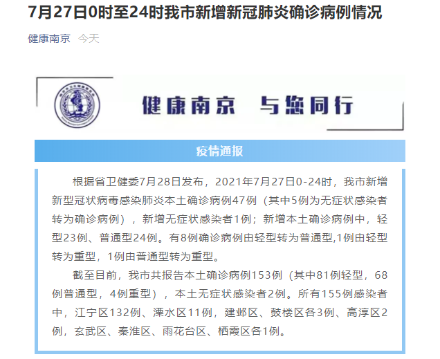 根据江苏省卫健委7月28日发布,2021年7月27日0-24时,江苏省南京市新增新型冠状病毒感染肺炎本土确诊病例47例(其中5例为无症状感染者转为确诊病例),新增无症状感染者1例;新增本土确诊病例中,轻型23例、普通型24例。有8例确诊病例由轻型转为普通型,1例由轻型转为重型,1例由普通型转为重型。