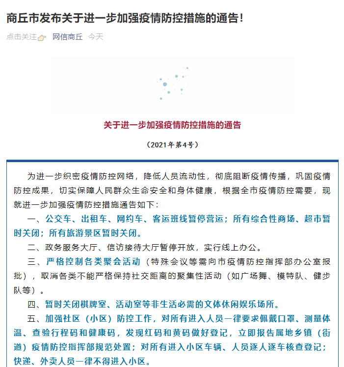 为进一步织密疫情防控网络,降低人员流动性,彻底阻断疫情传播,巩固疫情防控成果,切实保障人民群众生命安全和身体健康,根据全市疫情防控需要,现就进一步加强疫情防控措施通告如下:
