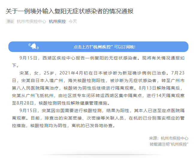 9月15日,杭州市西湖区疾控中心报告一例复阳的无症状感染者。现将有关情况通报如下。
