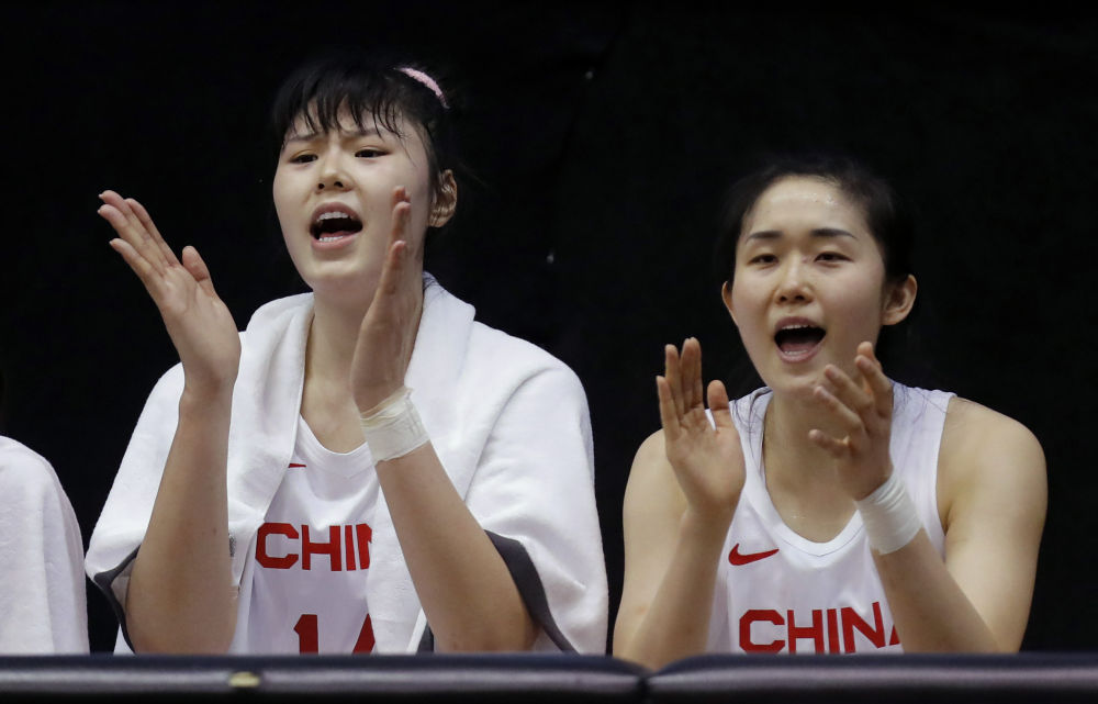 ↑2月10日,中国队球员李月汝(左)和潘臻琦在比赛中鼓掌。新华社发(普雷德拉格·米洛萨夫列维奇摄)
