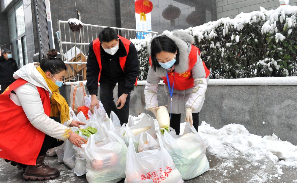 1月22日,在河南省安阳市建安社区一小区门口,社区工作人员在打包配送物资,准备为部分老人、居家隔离人员、行动不便人员等送货上门。新华社记者韩朝阳摄