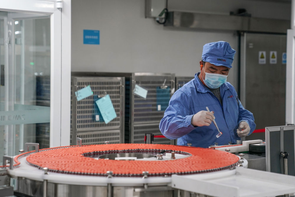 2021年7月8日,工作人员在北京科兴疫苗生产流水线上工作。新华社记者彭子洋摄