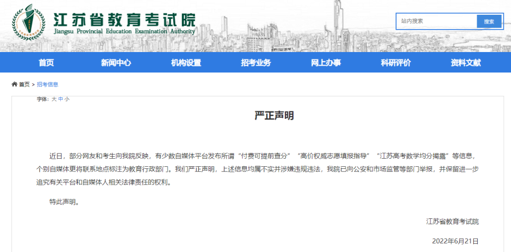 6月21日,江苏省教育考试院发布声明,称少数自媒体平台发布所谓“付费可提前查分”等信息不实,已向公安和市场监管等部门举报。声明全文如下:
