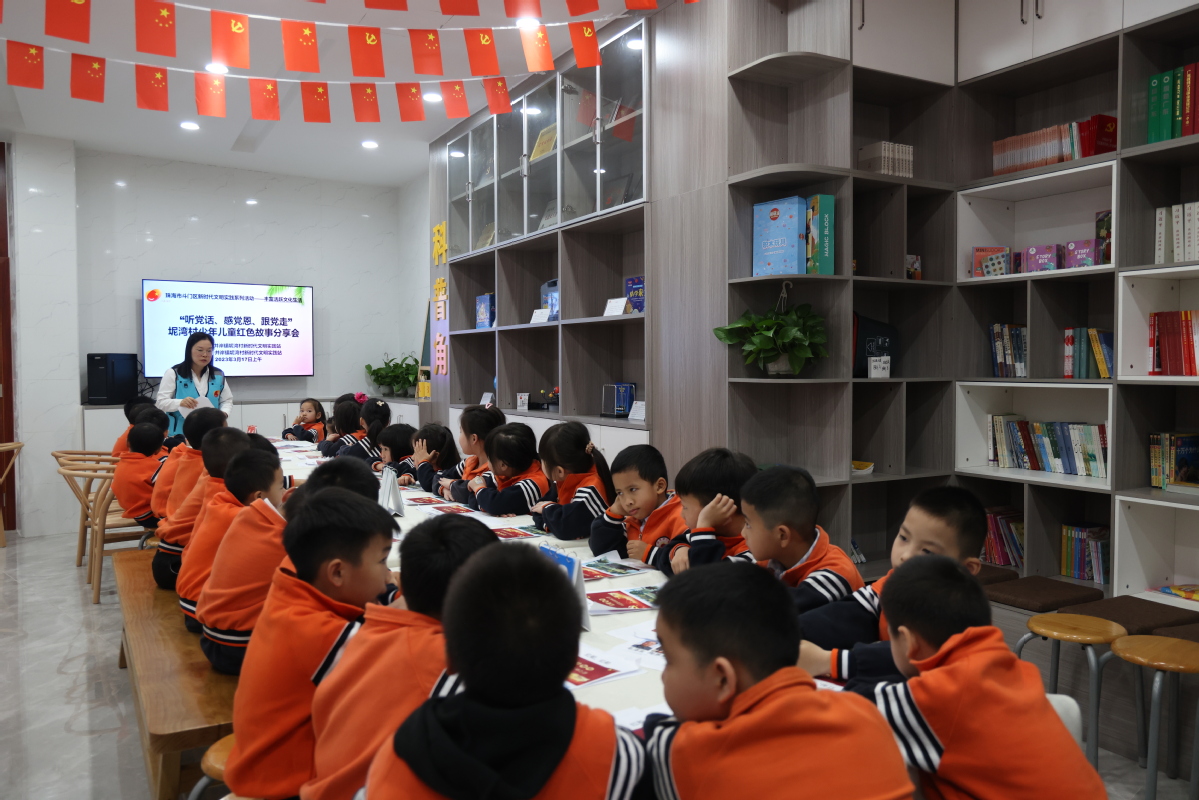 “红船精神/开天辟地/敢为人先的首创精神……”讲师在台上讲,孩子们在下面跟着读。“红船精神”的诵读,拉开了坭湾村本次红色故事游园会的序幕。30名孩子整整齐齐地坐在活动室里,认真听讲解,了解党的历史。寓教于乐的形式,让孩子们在快乐的气氛中有所学有所悟。