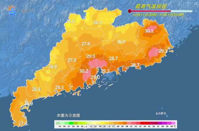 11日,雷州半岛中雨转阵雨,其余市县阴天到多云,局部有阵雨。最高气温:清远、韶关、河源北部、雷州半岛南部市县24℃~27℃,其余大部28℃~30℃。