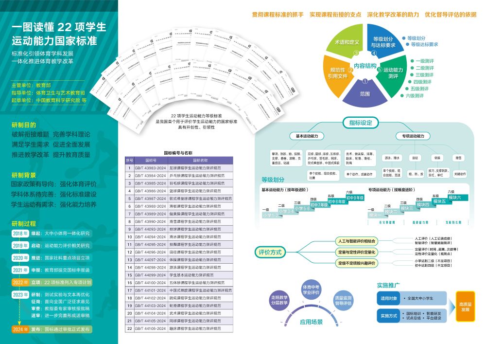 《足球课程学生运动能力测评规范》等22项国家标准,由中国教育科学研究院(以下简称“教科院”)牵头研制。该标准自2019年正式启动研究至2024年5月通过审批发布,历时5年。
