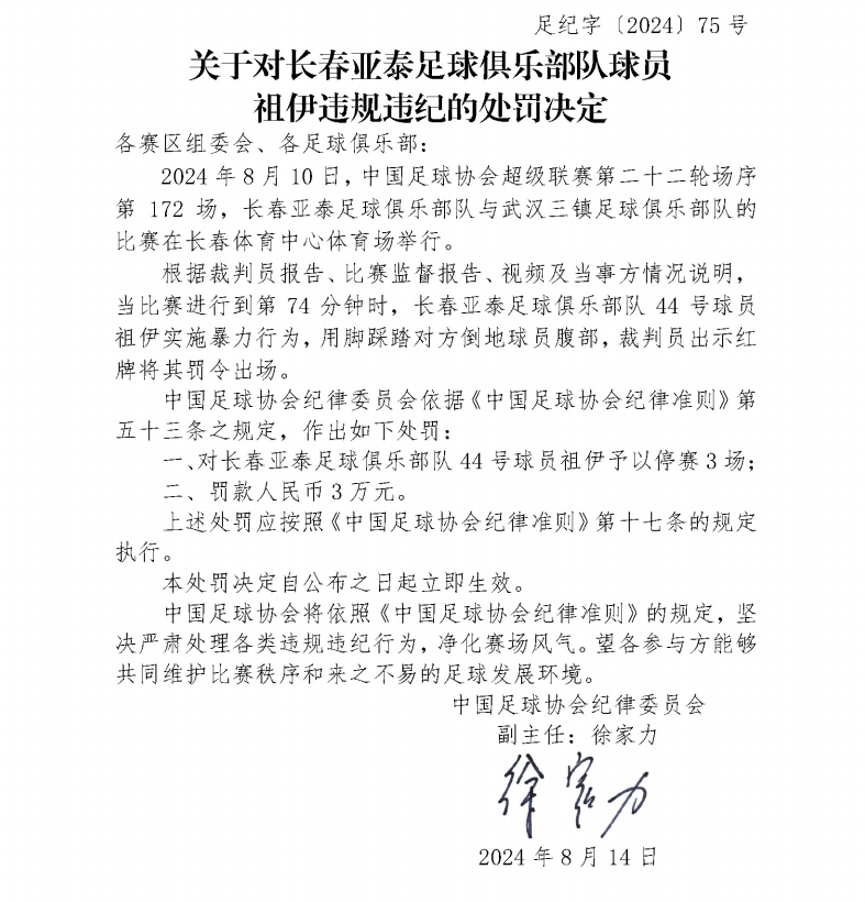 关于对长春亚泰足球俱乐部队球员祖伊违规违纪的处罚决定