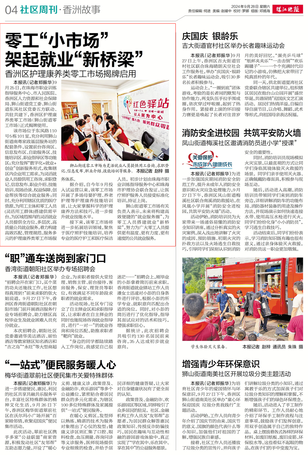 9月25日,在珠海市职业训练指导服务中心、市人民医院、香洲区人力资源和社会保障局、狮山街道党工委、狮山街道东风社区党委五方联动、共驻共建下,香洲区护理康养类零工市场(狮山街道零工市场)正式揭牌使用。