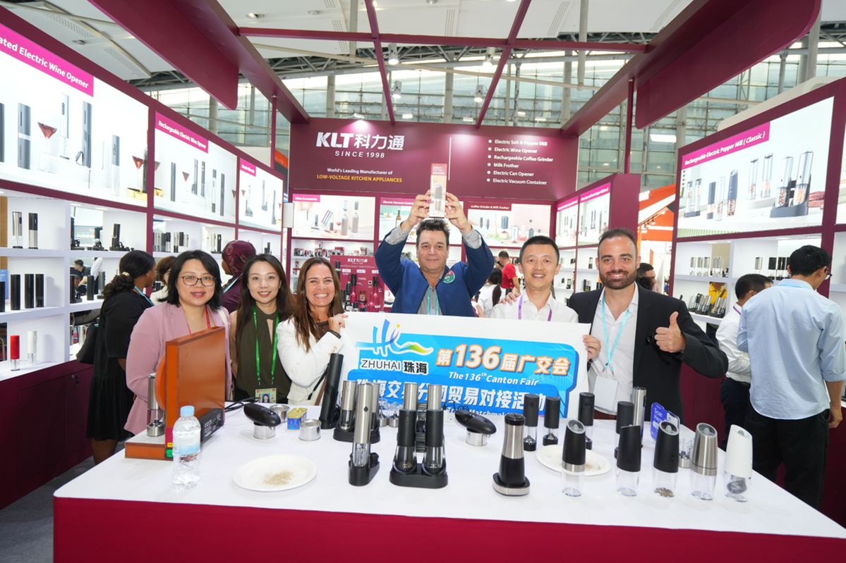 在珠海市科力通电器有限公司展位,科力通海外销售总监吴长明介绍公司情况,展示了融合开瓶、醒酒和存酒多个创新酒具的一站式专业侍酒服务新品“未来侍酒师-智能品酒礼盒套装”。现场还演示了电动红酒开瓶器8秒自动开瓶和退塞的便利性,赢得现场采购商一阵好评,纷纷留下联系方式希望进一步洽谈对接。