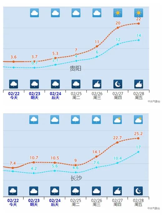 其中,一些城市的升温是“旱地拔葱”式的。像长沙25日至27日最高气温分别为9℃→14℃→23℃,直接一键切换到春天模式。贵阳26日最高气温11℃,27日就升至20℃,一天升幅达9℃。
