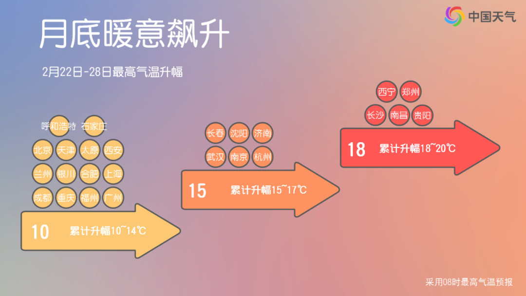 最低气温也将逐步回升,28日前后最低气温0℃线退至河北北部至山西中部,南方多地最低气温将回升到10℃以上。
