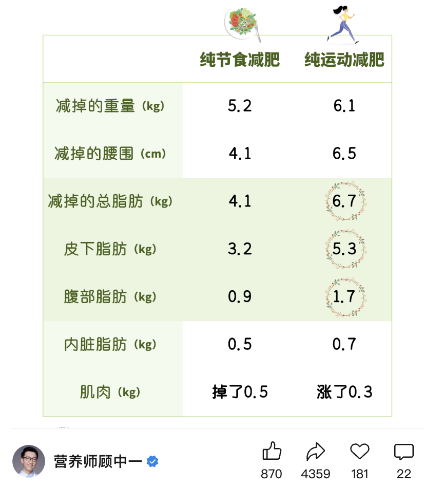 这一观点也得到了营养师顾中一的认可,如果你只追求短期快速降低体重数字,那少吃效果更快,但从长期健康减重角度还是劝你运动,毕竟减肥从来不是一时的事,而是一种生活方式。