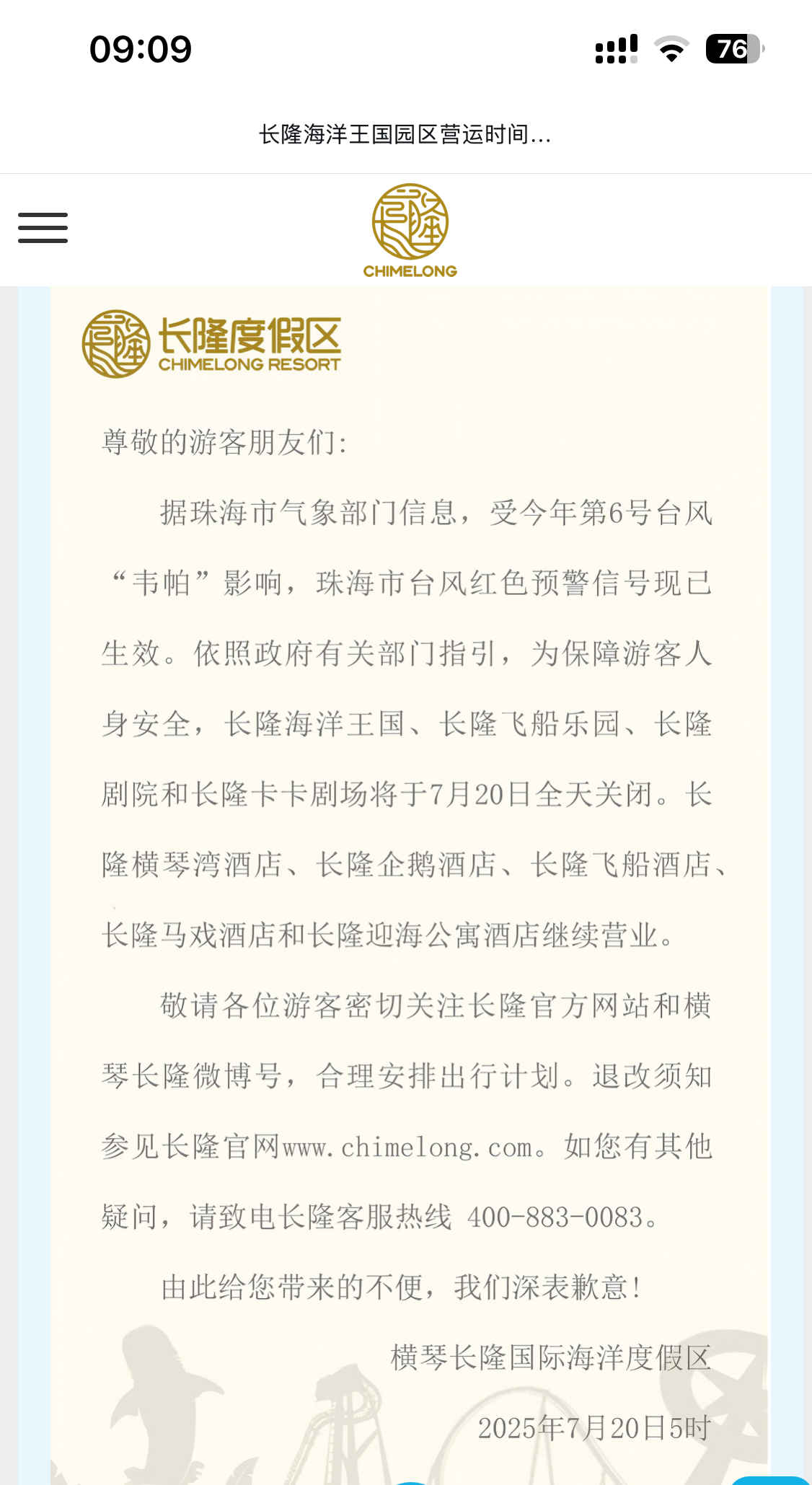 据珠海市气象部门信息,受今年第6号台风“韦帕”影响,珠海市台风红色预警信号现已生效。依照政府有关部门指引,为保障游客人身安全,长隆海洋王国、长隆飞船乐园、长隆剧院和长隆卡卡剧场将于7月20日全天关闭。长隆横琴湾酒店、长隆企鹅酒店、长隆飞船酒店、长隆马戏酒店和长隆迎海公寓酒店继续营业。敬请各位游客密切关注长隆官方网站和横琴长隆微博号,合理安排出行计划。退改须知参见长隆官网www.chimelong.com。如您有其他疑问,请致电长隆客服热线400-883-0083。由此给您带来的不便,我们深表歉意!
