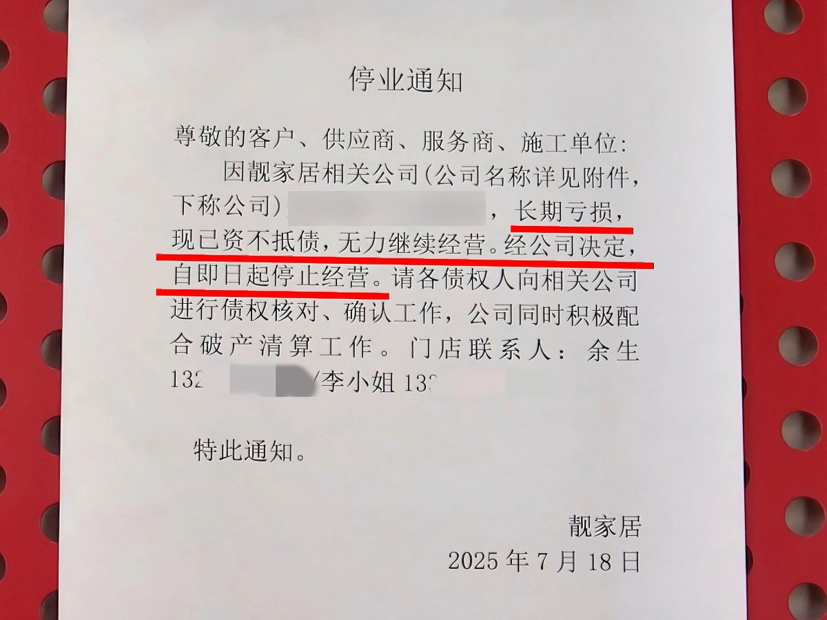 记者随后走访了位于“靓家居”摩尔广场店,内部一片杂乱,无人办公,门口张贴了一则落款为7月18日的停业通知,上面显示,公司因长期亏损现已资不抵债,无力继续经营,即日起停止经营,请各债权人向相关公司进行债权核对、确认工作,同时公司将积极配合破产清算工作。