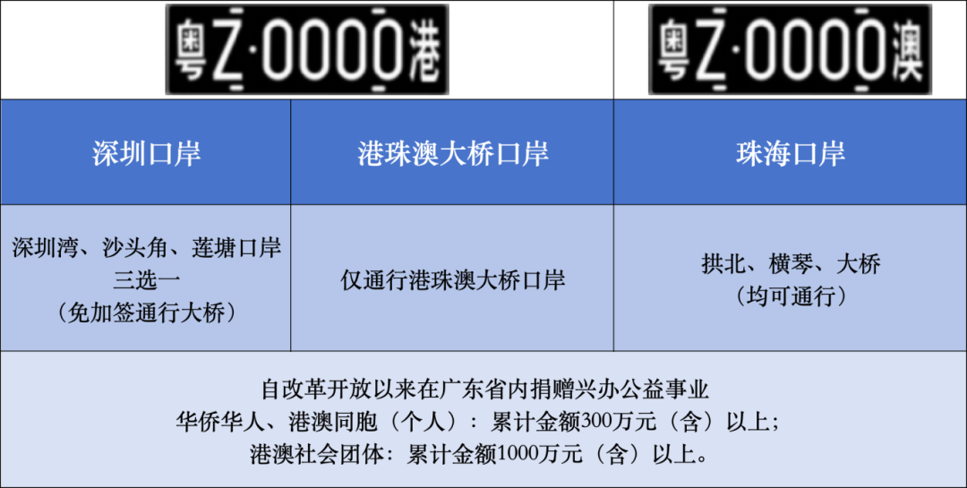 据悉,申请简明条件为,自改革开放以来在广东省内捐赠兴办公益事业,华侨华人、港澳同胞(个人)累计金额300万元(含)以上;港澳社会团体累计金额1000万元(含)以上。符合条件的捐赠人可申办1个深圳口岸或珠海口岸粤Z号牌和1个大桥口岸粤Z号牌。