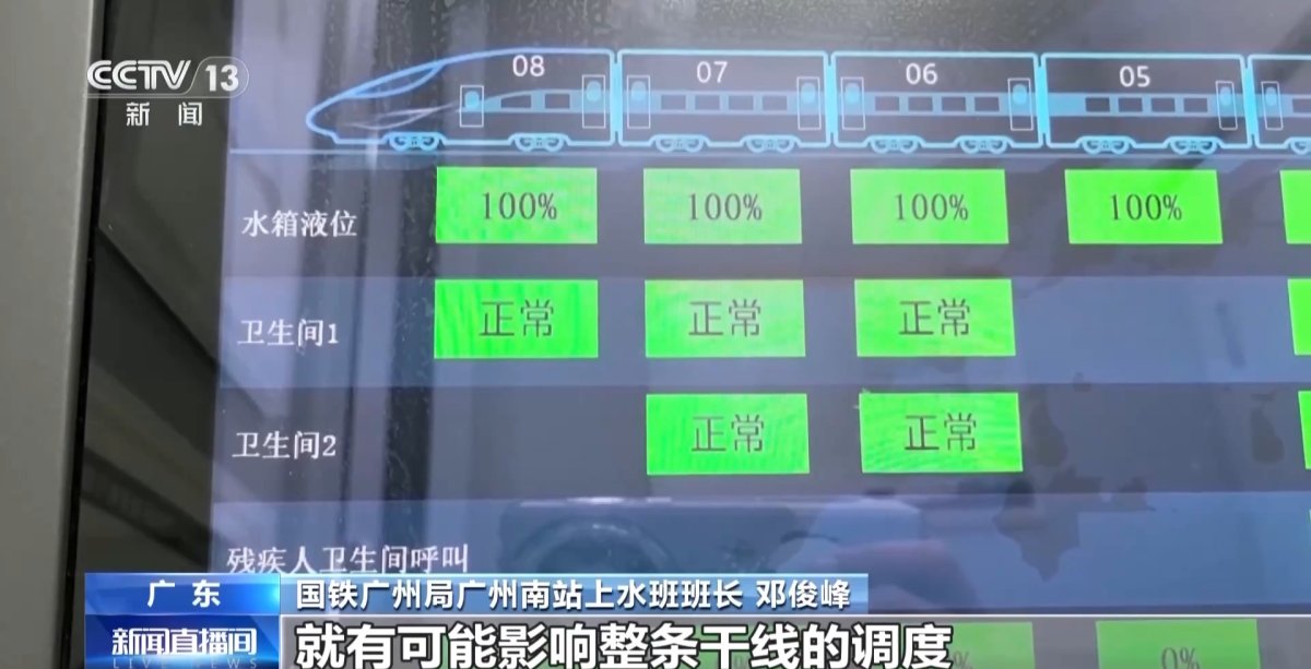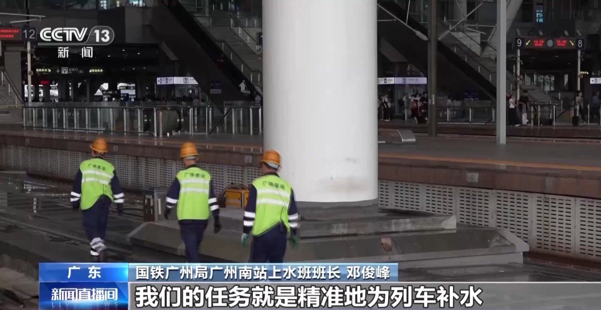 国铁广州局广州南站上水班班长邓俊峰:因为列车水箱容量是有限的,不可能满足全程用水,我们要尽力给它补满,保障旅客旅途的用水自由。