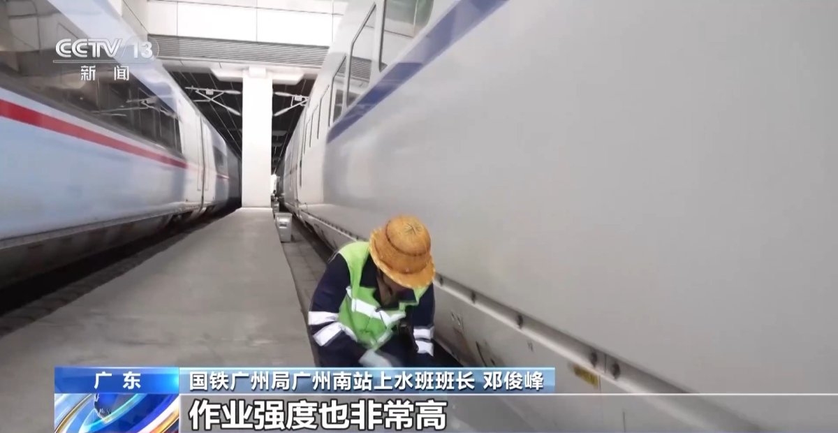 国铁广州局广州南站上水班班长邓俊峰:像这种跨线列车,一般只有10分钟的作业时间,我们还要留出几分钟复检,所以对我们的作业要求也挺高,作业强度也非常高。