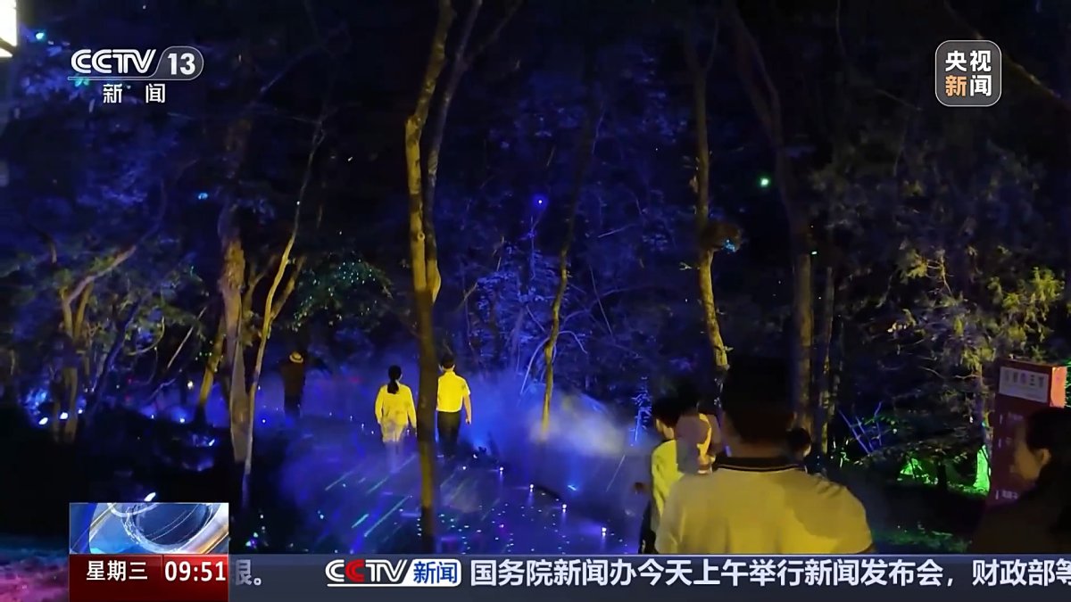 在八公山国家地质公园,不少游客选择到森林里避暑游玩,特别是到了晚上,景区通过光影秀打造了夜间森林的游览路线,还发放了15000余张儿童免费体验券,吸引游客到来。