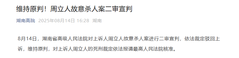 8月14日,湖南省高级人民法院对上诉人周立人故意杀人案进行二审宣判,依法裁定驳回上诉,维持原判,对上诉人周立人的死刑裁定依法报请最高人民法院核准。