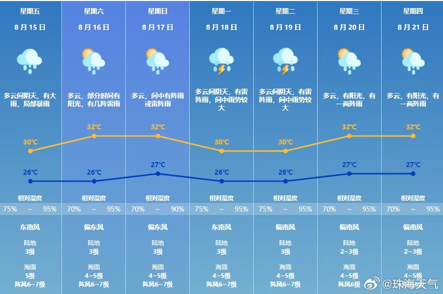 据珠海市气象台发布最新天气消息,18—19日有强降雨,目前南海中北部季风云团活跃,可能于周末至下周初发展为热带低压,下周初(18—19日)我市将有一次强降雨过程,暴雨风险较高。