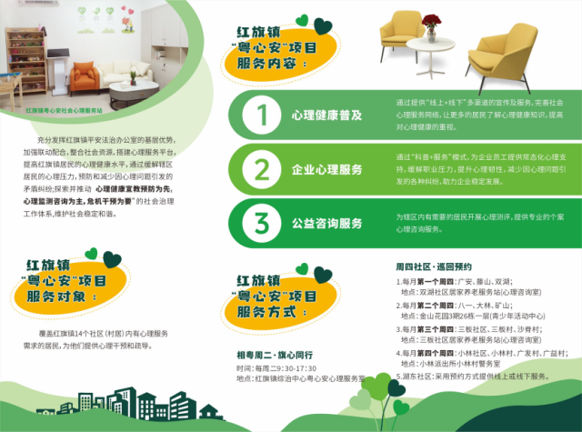 红旗镇下辖14个村居,常住与流动人口交织,心理健康需求呈现多元化、复杂化特征。传统“单点固定”服务模式难以满足全域覆盖需求,居民常因距离远、预约难错失服务。为此,项目组创新推出“1+4”双轨服务模式:以镇中心粤心安心理服务站为核心枢纽,每周固定时段提供常态化服务;同时将14个村居划分为4个片区,每周四由专业团队巡回驻点,确保每个村居每月至少获得1次服务。服务半径扩展至15分钟步行圈,突破地理壁垒,让服务“离家更近”。