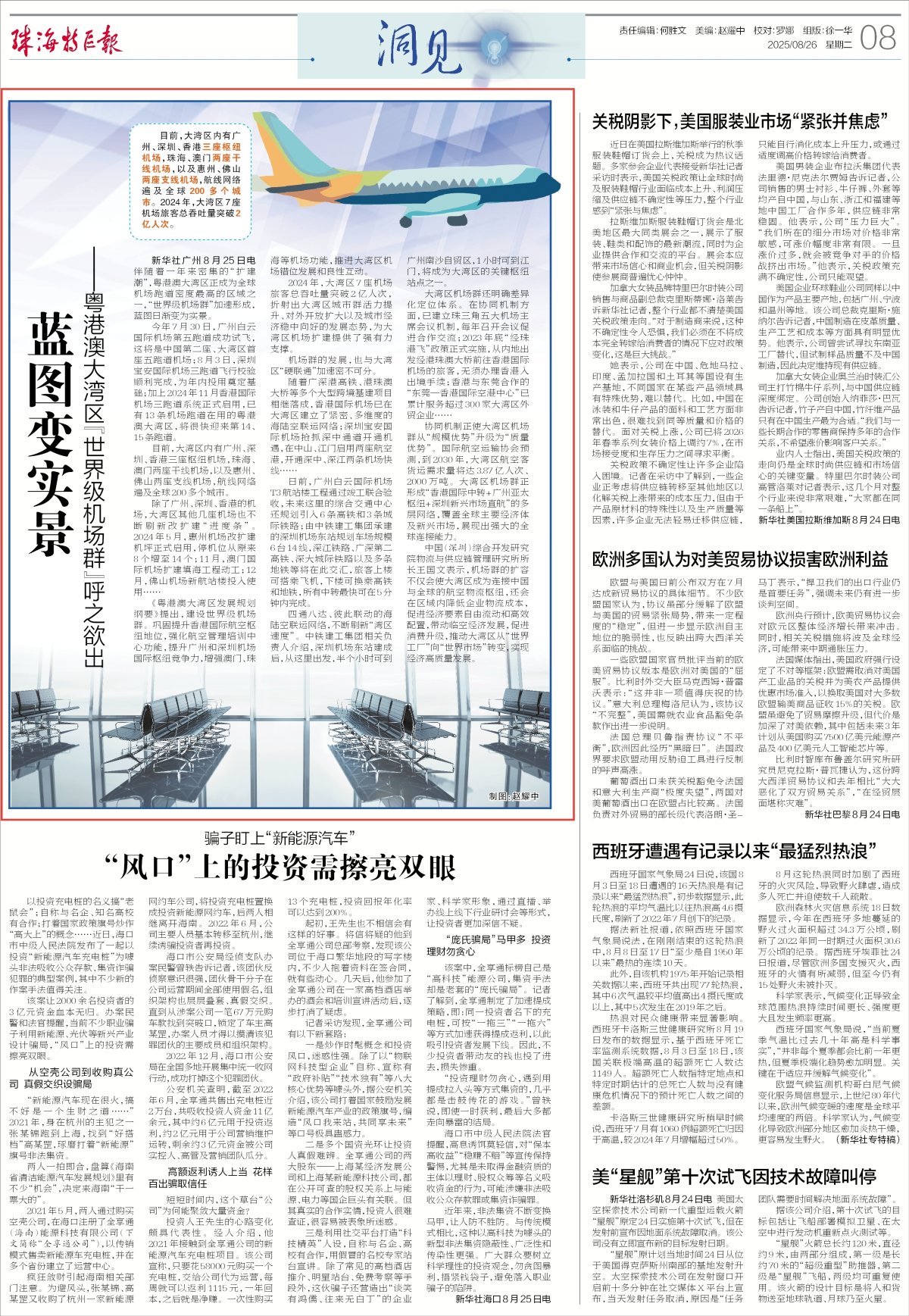 今年7月30日,广州白云国际机场第五跑道成功试飞,这将是中国第二座、大湾区首座五跑道机场;8月3日,深圳宝安国际机场三跑道飞行校验顺利完成,为年内投用奠定基础;加上2024年11月香港国际机场三跑道系统正式启用,已有13条机场跑道在用的粤港澳大湾区,将很快迎来第14、15条跑道。
