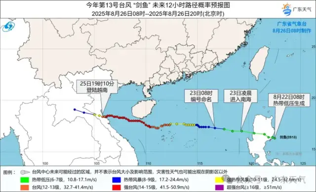 8月26日8时,今年第13号台风“剑鱼”中心位于老挝川圹省境内,强度为热带风暴级(8级,18米/秒,998hPa)。预计,“剑鱼”将以每小时25公里左右的速度向西偏北方向移动,强度继续减弱。预计27-29日广东大部多云,午后部分市县有(雷)阵雨,气温有所升高,需注意防暑防晒,并防范短时强降水和雷雨大风的不利影响。
