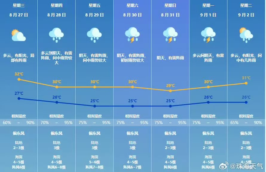 预计我市明天多云有阳光,局部有阵雨;本周中后期(28-31日)受热带云团影响,降雨频繁,海面风力较大;展望下周初期多云有阵雨。