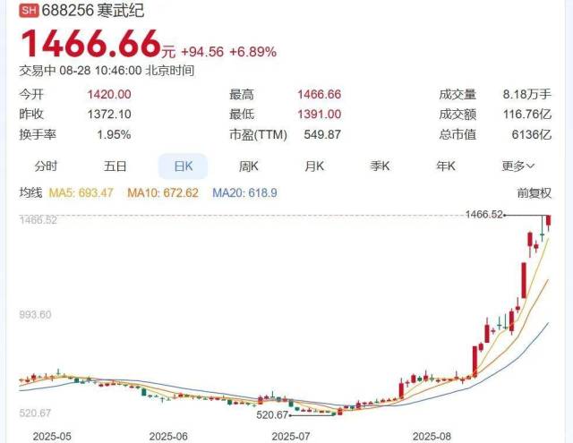 今天(8月28日)早盘,寒武纪延续涨势,股价盘中涨超6%,再次超越贵州茅台。