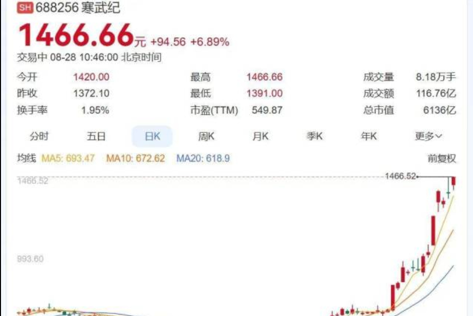 8月28日,近期A股市场上备受关注的寒武纪股价大涨15.73%,收盘价为1587.91元/股,市值约为6643亿元。