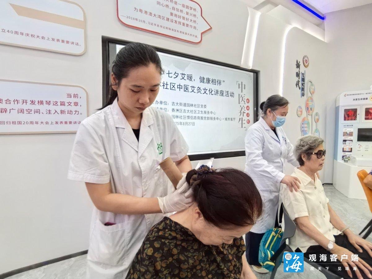 同日,吉大街道园林社区把七夕活动搬进情侣路商圈党群服务中心·城市客厅,活动特邀吉大社区卫生服务中心的医生谭白山用通俗易懂的语言,从艾灸的起源说起,结合《黄帝内经》等经典医籍,生动介绍了艾灸文化的发展脉络,并针对“常见穴位如何定位”“不同体质的艾灸方法”等问题等现场提问逐一拆解,让居民们感受到传统中医的深厚底蕴。理论学习刚结束,艾香已起——医生点燃艾条,示范距离、角度、时长,居民依次体验温热透穴的舒适感,纷纷交流心得。