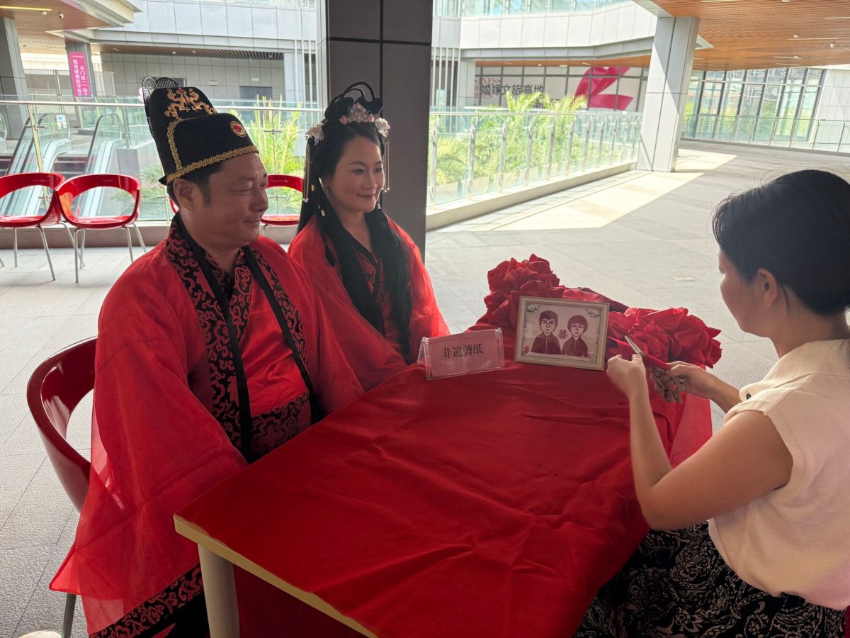 斗门区民政局婚姻登记处则邀请了区非遗剪纸传承人现场创作“肖像剪影”,赠送定制“同心框”。新人们还可以参与“情投意合”游戏、打卡留念等互动游戏,领取宋韵书签、婚姻箴言卡的伴手礼。斗门区民政局婚姻登记处还开展了“幸福婚姻家庭讲堂”,特邀国家级心理咨询师为新人带来“婚姻生活第一课”。