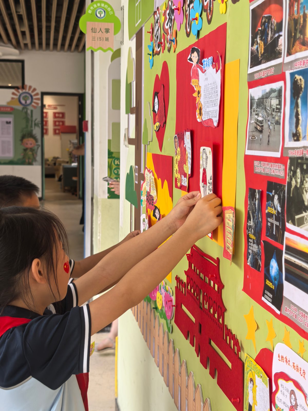 早晨8时,学生们陆续入校,每人手持一张自制抗战英雄人物卡片,粘贴在班级门口的主题展板上。一名三年级学生表示,要向英雄致敬、向先辈学习,做勇敢坚定的少年,“他们用生命换来了现在的新中国,让我们有了幸福的生活。”