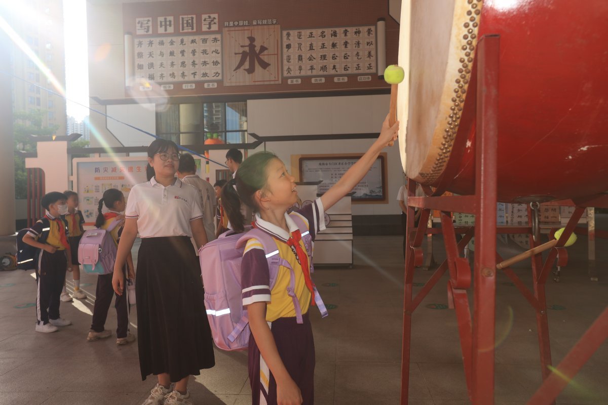“成长门”前,校长、教师与学生代表笑脸相迎,让孩子们一踏入校门,就倍感亲切。在飞花令擂台区,围绕“开、学、迎、新”四字,同学们诗词接龙、对答如流,每答出一句,就击鼓一声,鼓点与欢呼交织回荡,5位老师组成的“评委团”不时点头称赞。