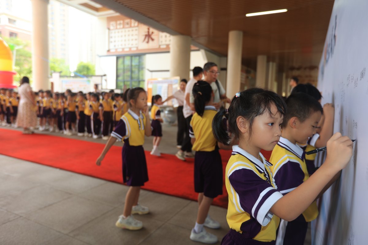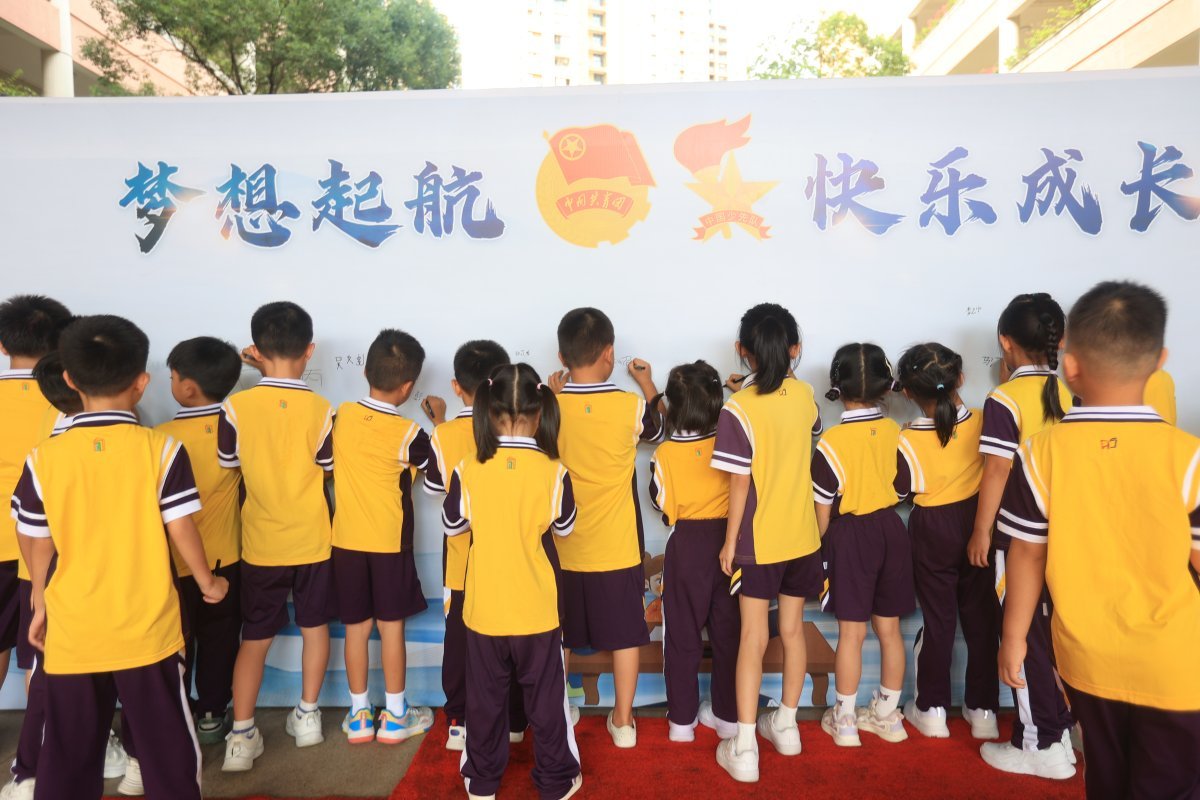最令人期待的,莫过于一年级新生的“开笔礼”。“小萌新”们在老师的陪伴下跨过“成长门”,在签名墙上一笔一画认真书写自己的名字。随后行拜师礼、接受朱砂启智、击响“明智鼓”,宣告求学之路正式开启。