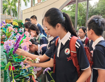 踏入学校,每位师生将假期德育作业——亲手制作的绒花轻轻插入校园花墙,形成一道绚丽的风景线。绒花作为中国传统手工艺之一,源于唐代,谐音“荣华”,寓意富贵吉祥、美好祝愿。一朵朵以丝绒精心捻搓而成的花朵,色彩鲜艳、形态逼真,不仅展现了非遗技艺的独特魅力,更凝聚了师生对新学期的深切期盼与愿景。